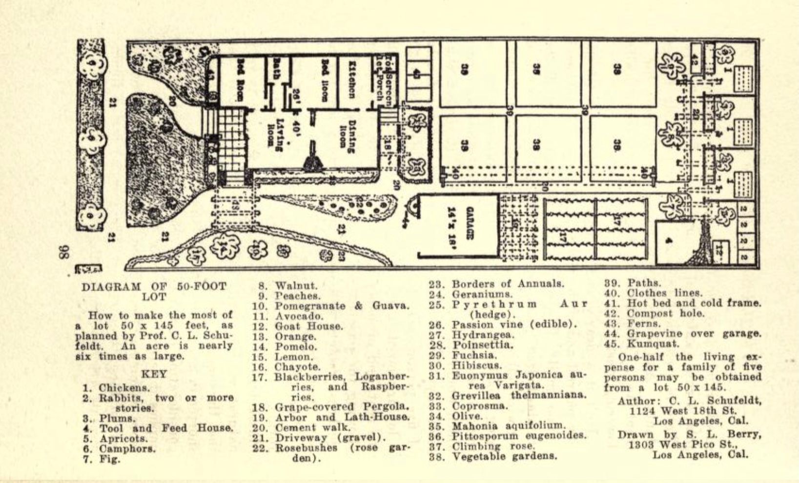 Smythe filled his book with illustrations of what a garden home could look like. In one diagram, a five-room bungalow on a ⅙-acre lot — “the standard-sized lot in Los Angeles” — sits draped in flowering vines and surrounded by rose bushes, vegetable beds and fruit trees. Behind the garage is a blackberry bramble, chicken coops and rabbit hutches.